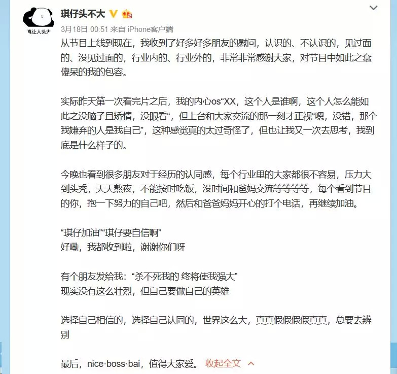微博网友@二禁病圆圆脸认为,白宇的经纪人琪仔的表现就是一种典型的的职场新人反射,这是职场上遇到的一种普遍问题。“可这个世界真实的一面,往往就是需要你排除万难快速成长。努力到什么程度才够呢?只有出色地完成工作才是衡量标准啊!”