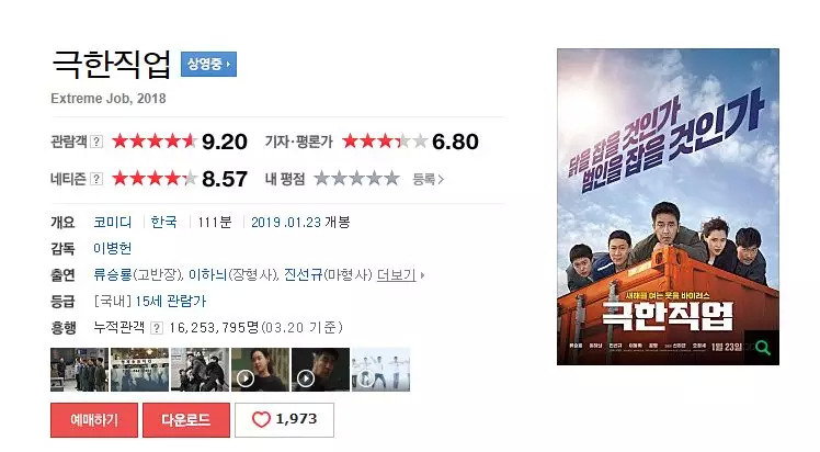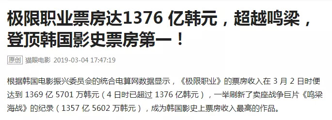 截至目前,《极限职业》已经收获了近1400亿韩元(约8.3亿RMB)以及动员了1620万观影人次,而在成本制作上,电影算得上实实在在的“小成本影片”,最终来了一次大逆袭。