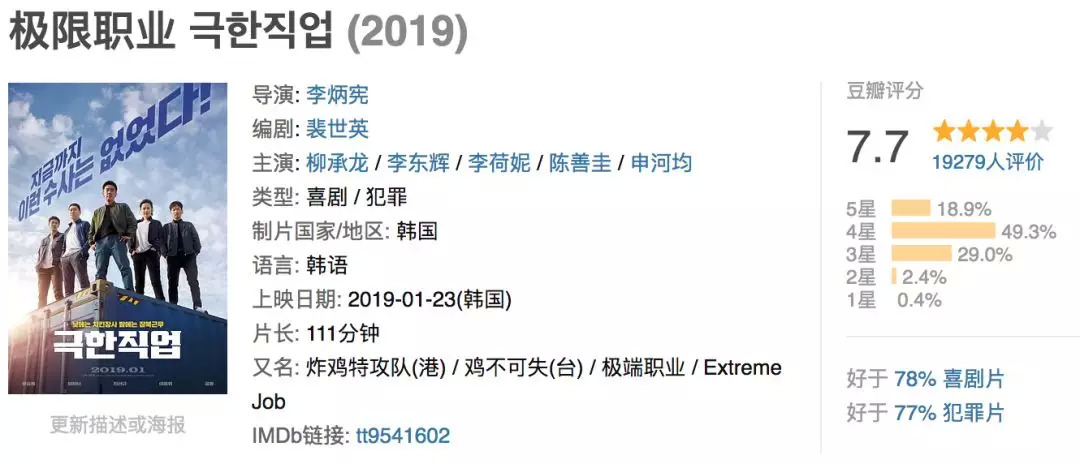 豆瓣上,两部电影的评分也能说明一些问题,当然不止在豆瓣,韩国观众在本土的影评网站NAVER上,毫不吝啬地为《极限职业》打上了9.2分的高分。