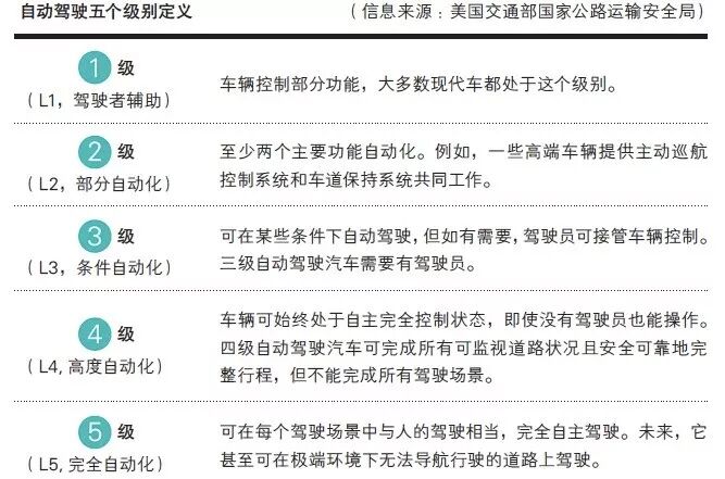 其实,严格意义上,自动驾驶并没那么“科幻”和“硬核”。美国交通部国家公路运输安全局定义了自动驾驶的五个级别。