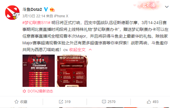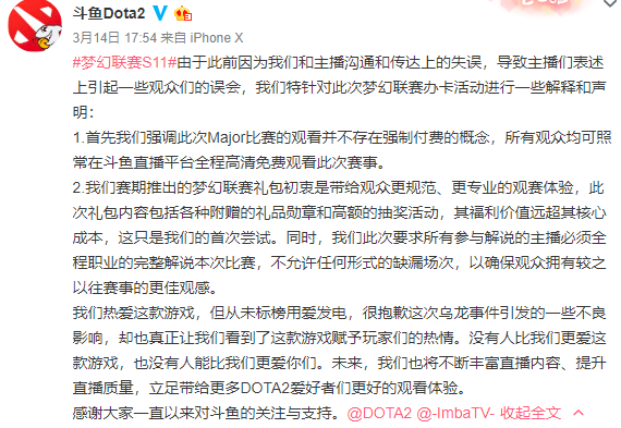 3月13日,斗鱼DOTA2官方微博宣布“梦幻联赛S11”于3月14日正式开赛,由于斗鱼拥有独家官方直播版权,因此斗鱼方面希望通过这个机会来进行电竞付费观赛的试水——比赛期间观众需要单独花费6元购买“办卡”道具才能观赛。