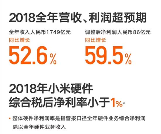 近日,小米公布2018年财报,报告中指出小米2018年总收入1749亿元,同比增长52.6%;净利润人民币86亿元,同比增长59.5%;硬件综合税后净利润率小于1%;研发投入58亿元,占收入3%;互联网收入160亿元,约为总收入9%。