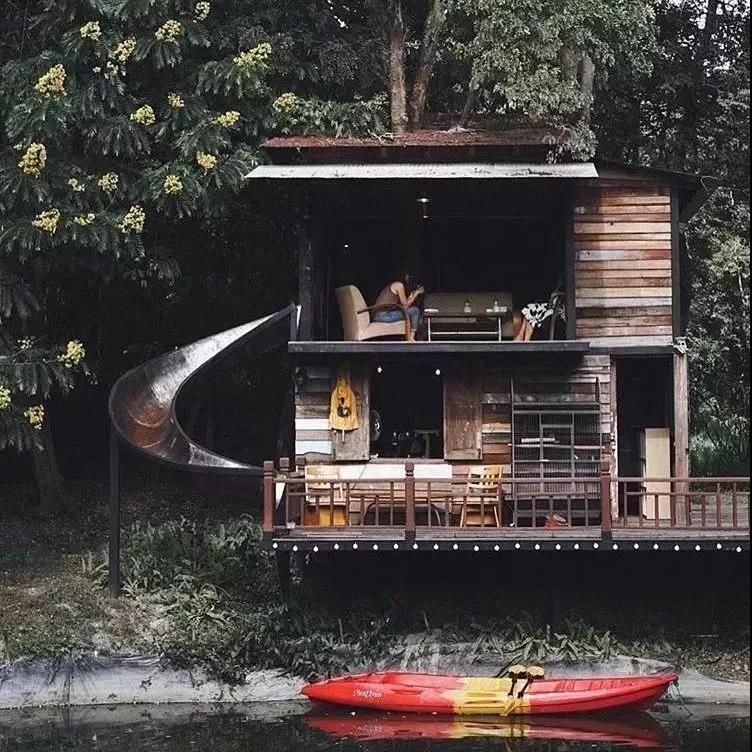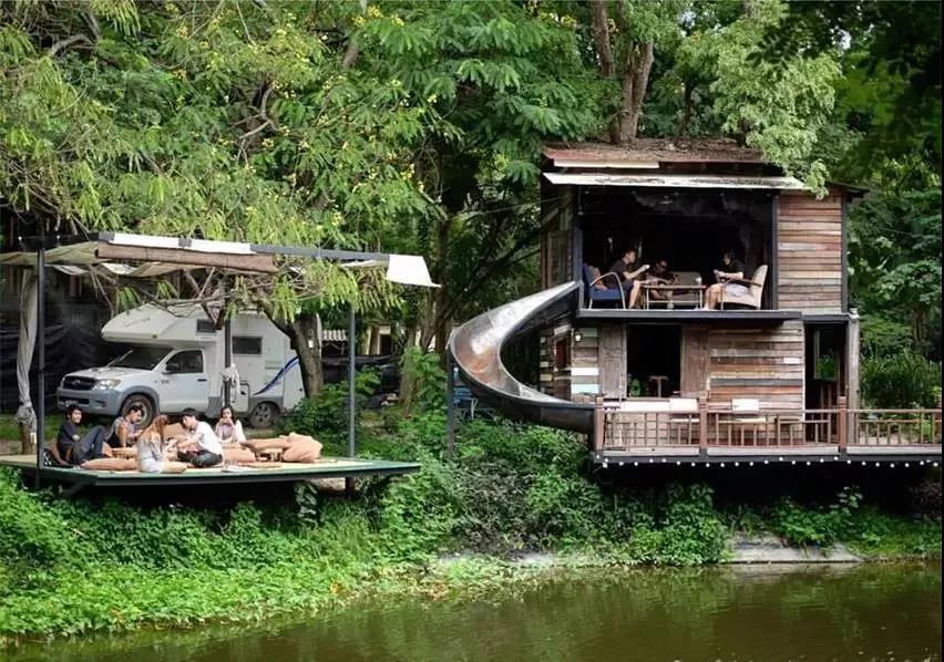 No.39咖啡馆靠近悟孟寺(Wat Umong),环境僻静而清幽,掩映在树林中,建筑沿湖而建。咖啡吧台就在小木屋的对面,这里还有一个最大的特色就是湖边有一个小木屋,可以从二楼坐滑滑梯下来。