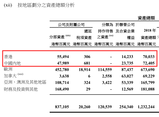 据财报,截至2018年底,长和的总资产为12322.44亿港元,其在香港及内地的资产分别为700.33亿港元和724.05亿港元,合计为1424.38亿港元,按此计算,长和在香港及内地的资产占其总资产的比重仅为11.55%。而在2015年底时,长和在香港及内地的资产总和占其总资产的比重还高达19.21%。下图为财联社对长和业绩公告的截图: