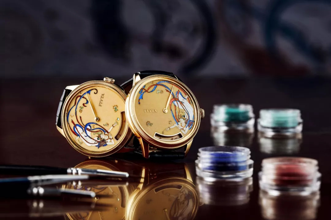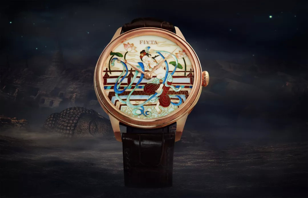 飞亚达大师系列敦煌主题的珐琅腕表,便是选取了257号石窟内的《鹿王本生图》、320号石窟内的《胡旋舞》和321号石窟《菩提树双飞天》作为创意灵感。