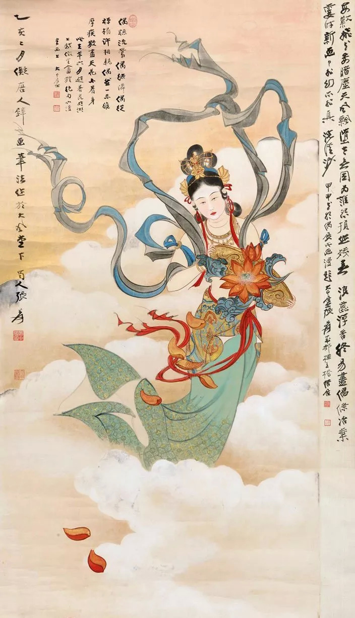 最为人们熟悉的,便是民间广为流传的各式《天女散花》图,此时飞天已经完全东方女性化,是为人们送祝福的女神。