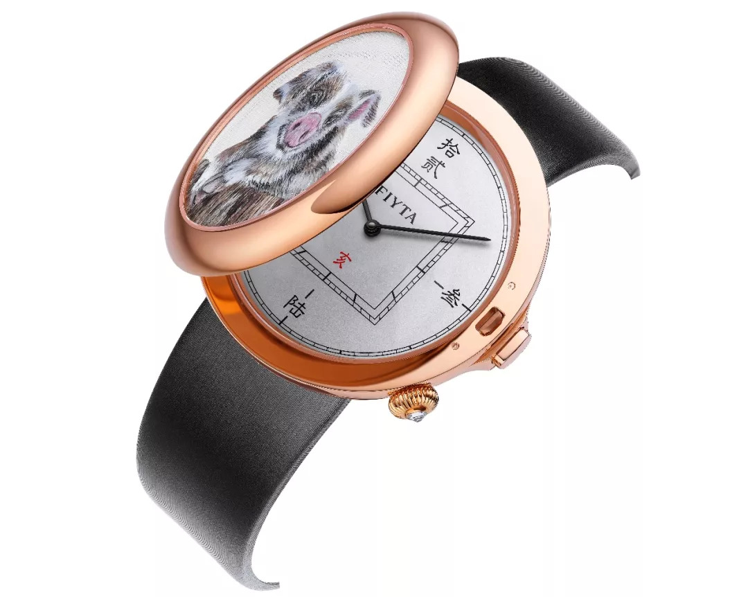 因此飞亚达生肖表款采用了猎表风格设计,将精微绣作品置于正面表盖,打开或者合上时,都可以欣赏美丽的生肖动物。