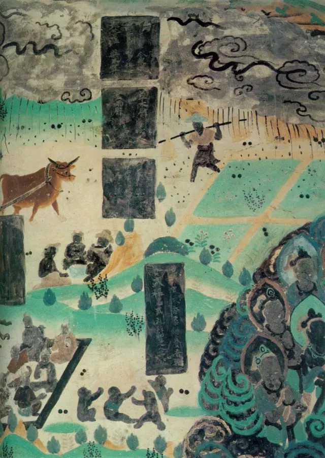 因此唐代敦煌兴建石窟也颇多,石窟内壁画涉猎内容也更丰富,当下时代的民生故事被记录下来,有农田春耕,也有胡女旋舞。