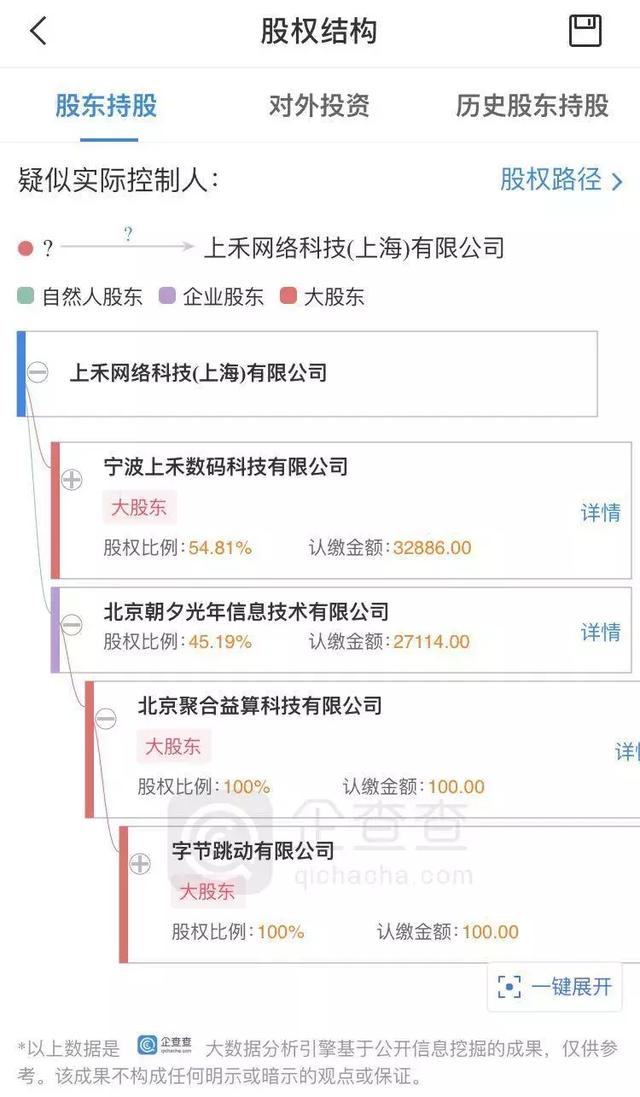 根据企查查资料,上禾网络的大股东为宁波上禾数码科技有限公司,股权占比为54.81%。而剩下45.19%的股权来自由字节跳动控股的北京朝夕光年信息技术有限公司。同时上禾网络的法定代表人已变更为今日头条的高级副总裁张利东,公司监事也同时变更为抖音创始人、今日头条技术总监梁汝波。