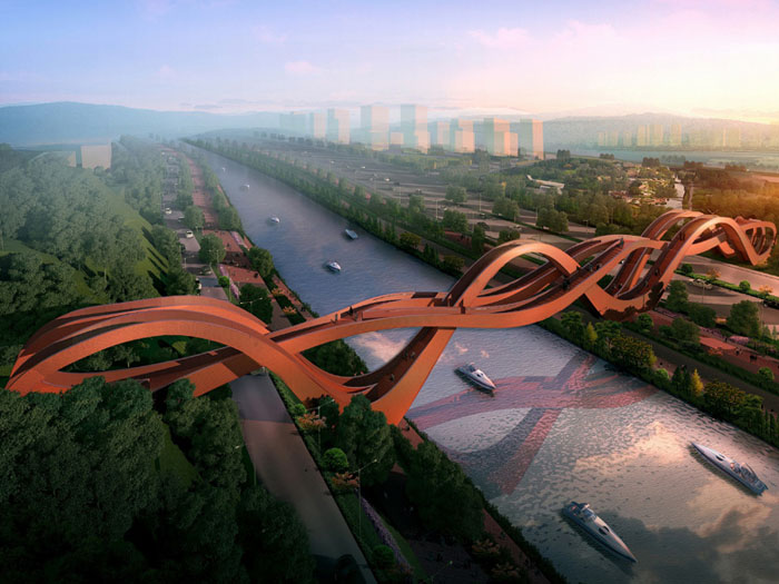 这座让人过目不忘的的大桥有着流线型的设计,它横跨在湖南长沙的龙王河上,建成后将被作为人行天桥使用。大桥的设计团队来自荷兰,这个作品为他们夺得了去年的国际设计大奖。莫比乌斯带以及中国结是这座大桥设计的灵感来源。