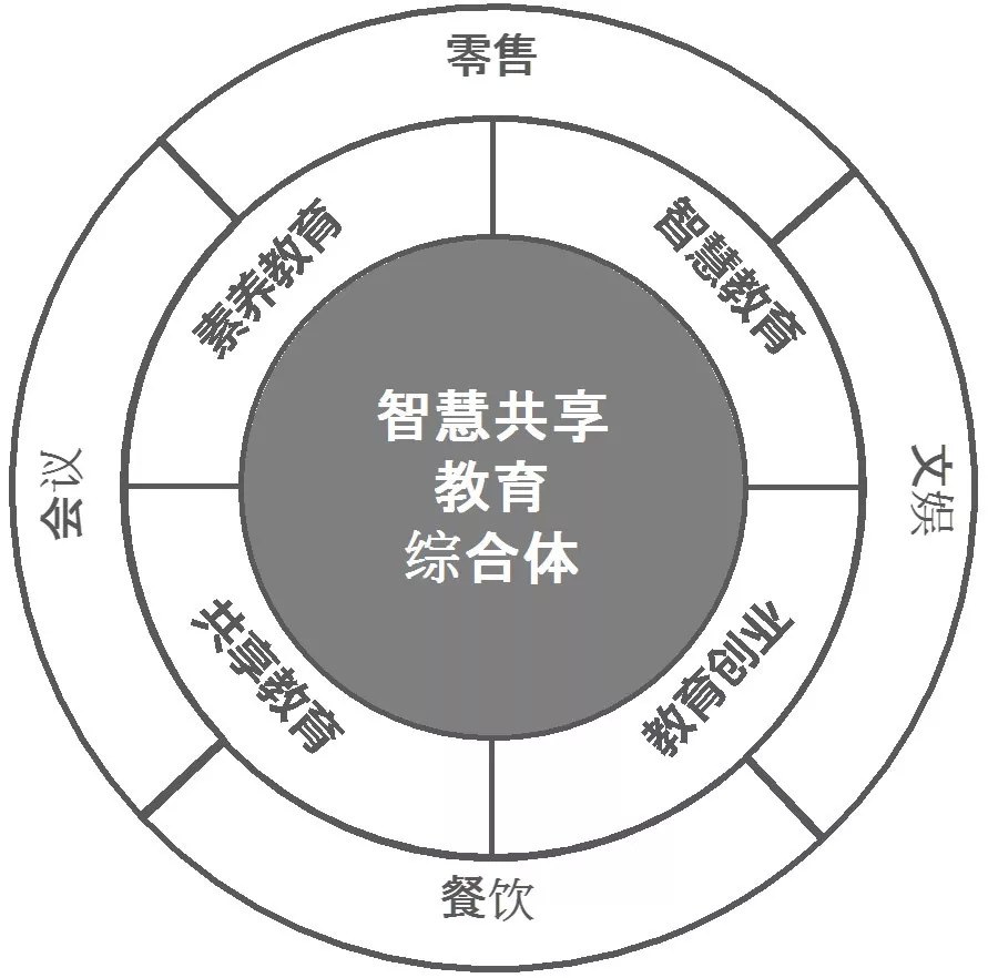 教育产业园围绕目标客群的教育需求,以产业园区的模式,通过引进多家教育机构形成教育服务产业集群,同时通过建立公共图书馆、体育馆、餐饮中心、互联网服务平台等,实现教育服务资源的集约共享。教育产业园一般采取教育培训+互联网+产业园的发展模式,在功能载体上主要由教育机构集聚区、公共资源共享区、互联网教育平台构成。