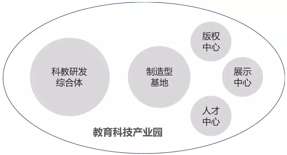 基于教育全产业链视角的分析,结合东滩顾问多年在产业研究领域的经验,同时,通过对睿泰数字产业园、泰山教育装备产业园、宁波教育科技产业园等典型园区案例的研究,我们将教育科技产业园构成归为“1+1+3体系”的五大核心产品:科教研发综合体、制造型基地、版权中心、展示中心和人才中心。