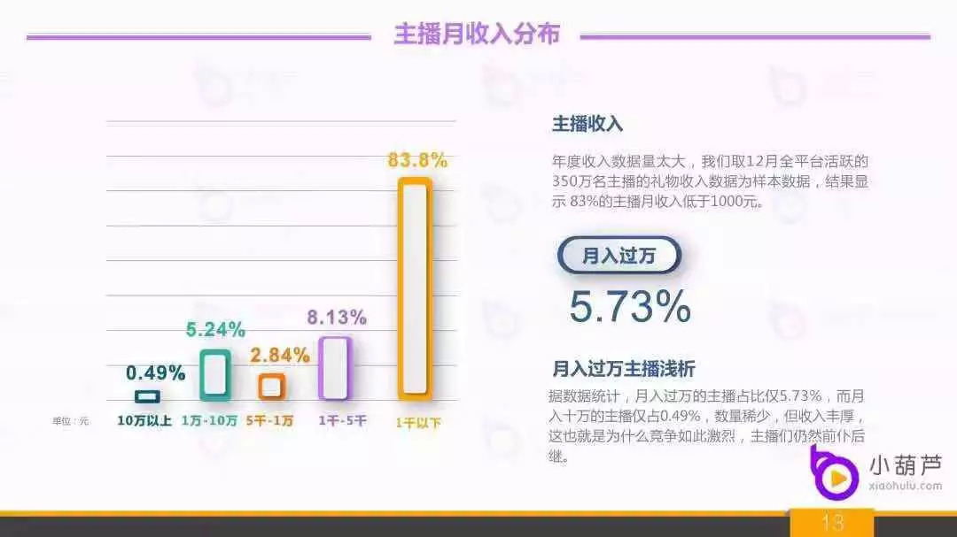 二八定律也在直播业存在,挣得多的都是凤毛麟角。最近有一份直播行业的报告,里面提到,月入10000元以上的主播只占总数的6%,有近84%的主播只赚1000元。