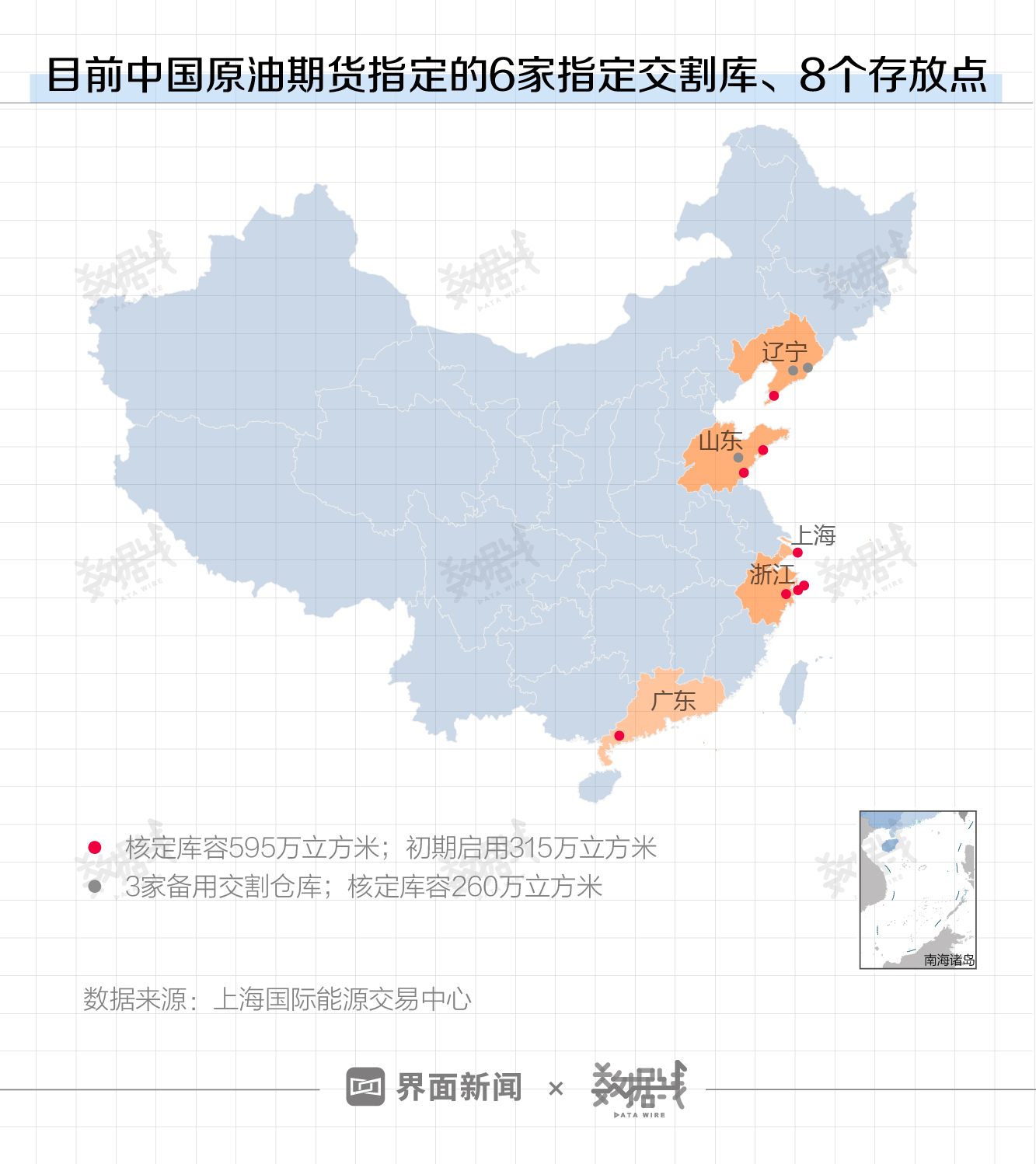 目前,INE批准了六家原油期货指定交割仓库,共八个存放点,核定库容595万立方米,初期启用315万立方米。其中,辽宁1个、山东2个、上海1个、浙江3个、广东1个。此外,批准了三家备用交割仓库,核定库容260万立方米,其中辽宁2个、山东1个。
