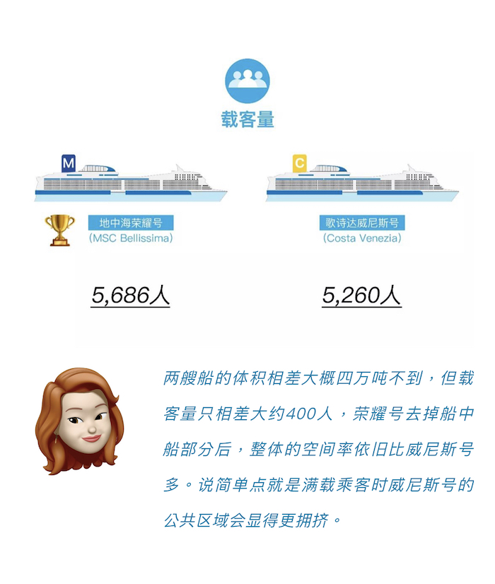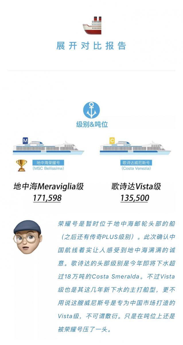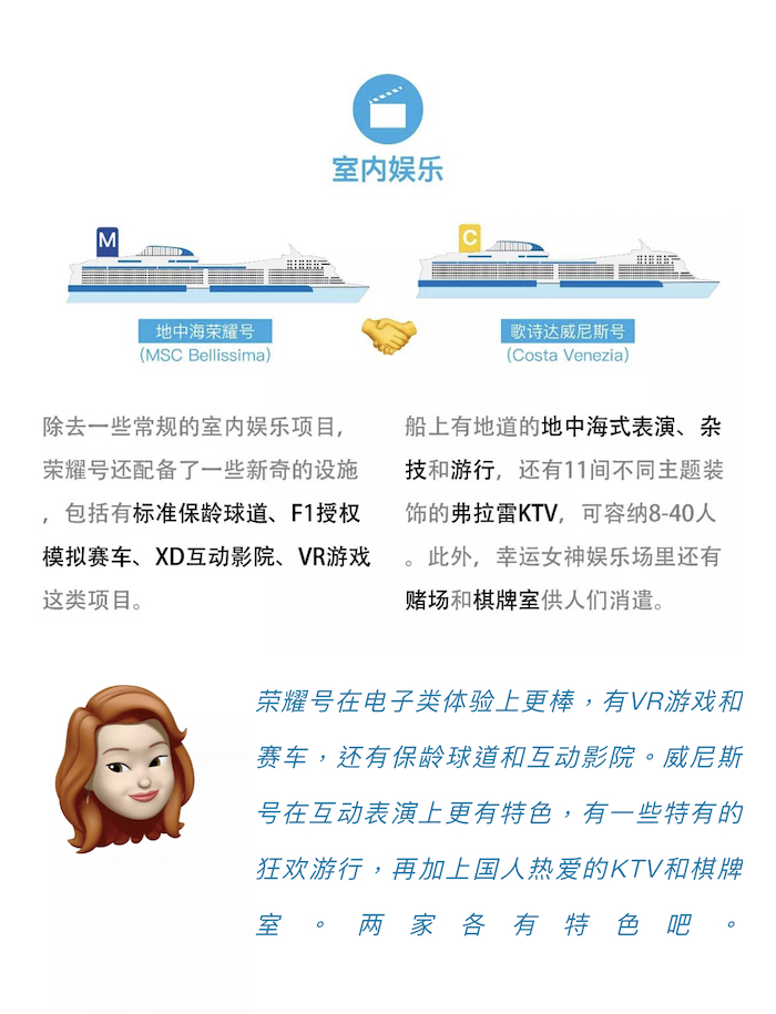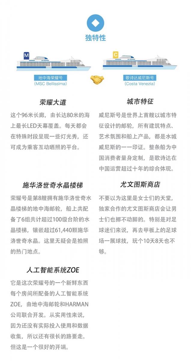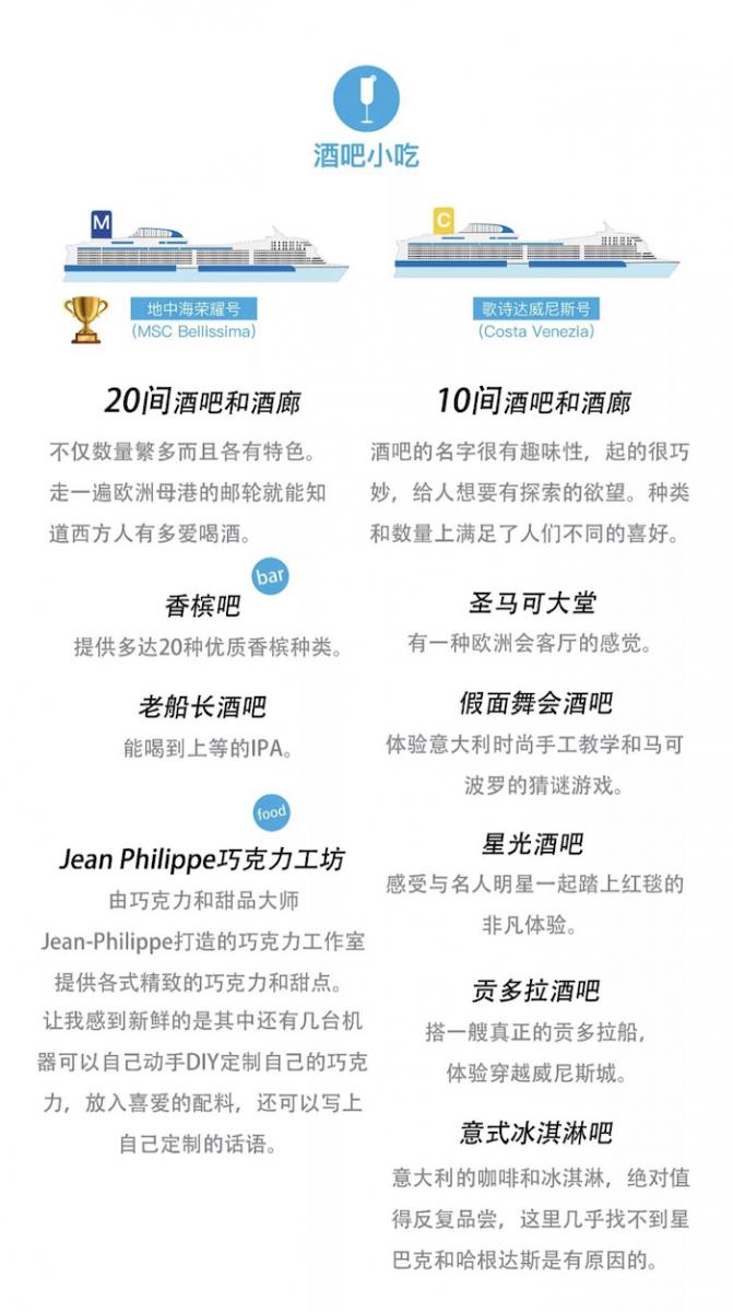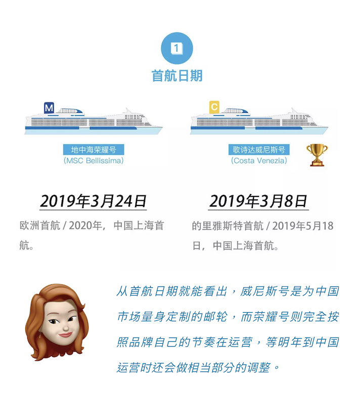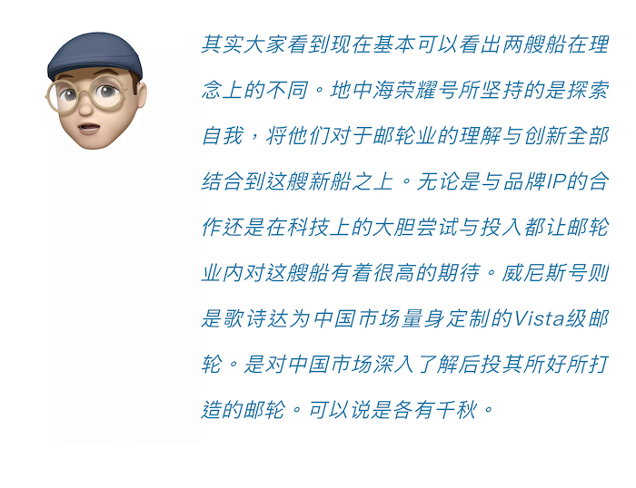 两艘即将来到中国的邮轮,经过对比后或许中国游客会更偏向歌诗达威尼斯号吧。毕竟从硬件设备和软件服务上来说,这艘船都给人一种亲切感。感觉邮轮更多适合家庭出游,那么威尼斯号上的吃、喝、玩、乐、购的确都能满足中国消费者的心里需求和预期。但不能否认的是,如果想更多感受欧洲文化、体验地道邮轮游,还是选择地中海荣耀号比较好。