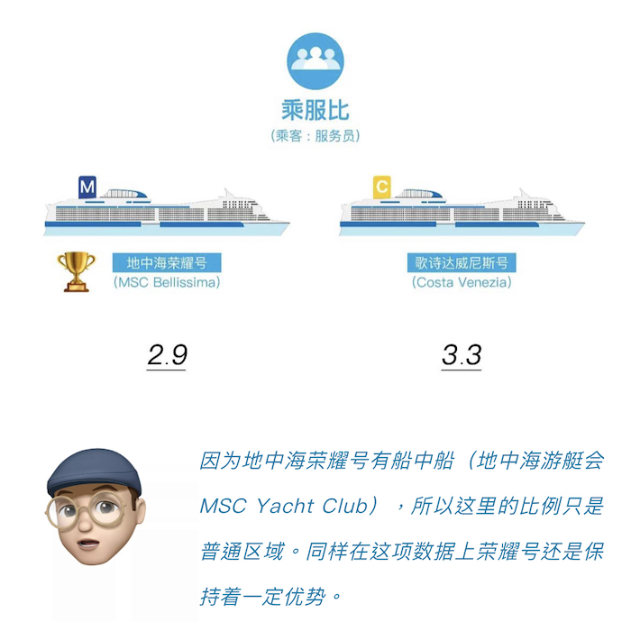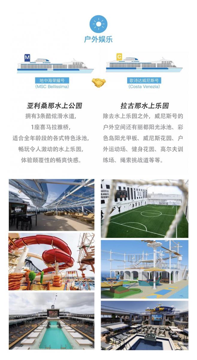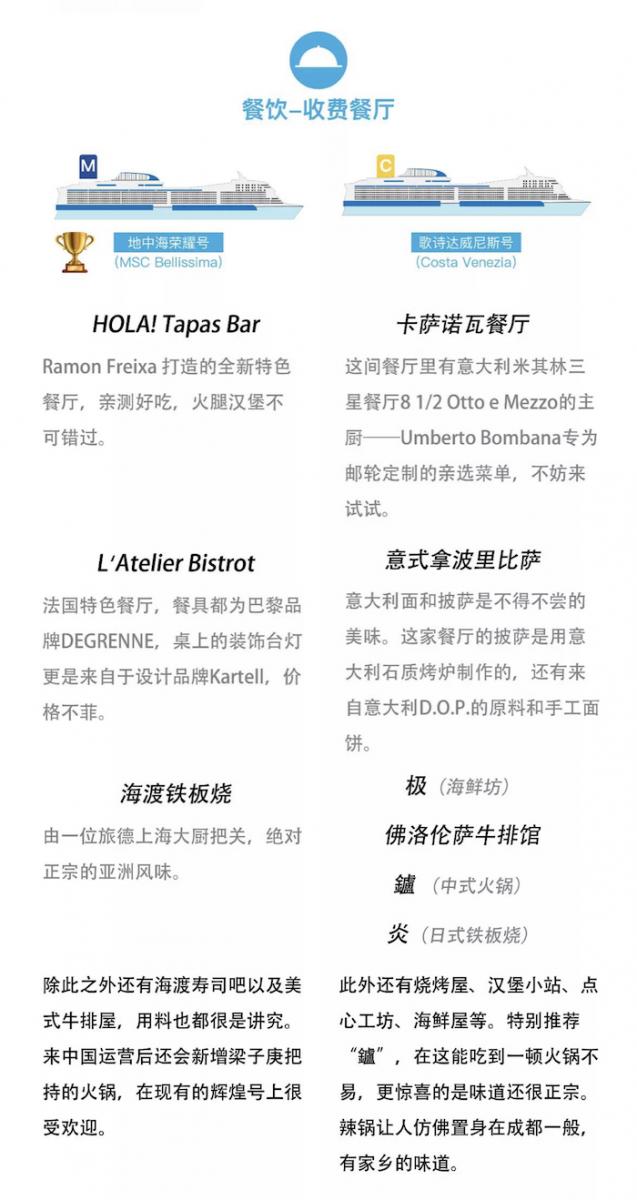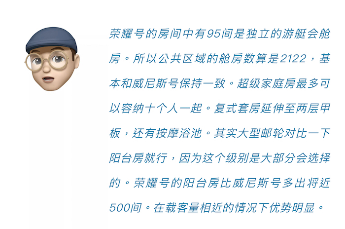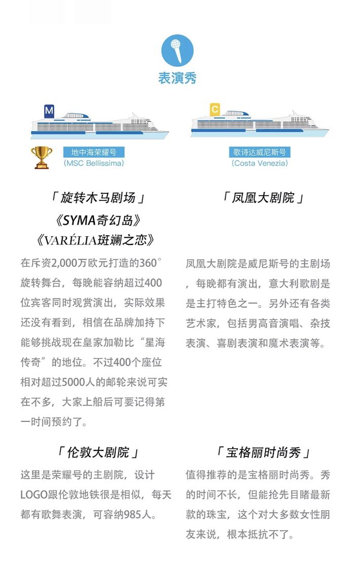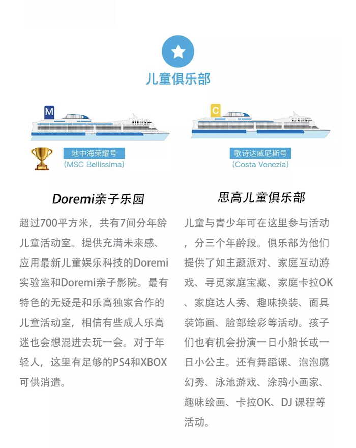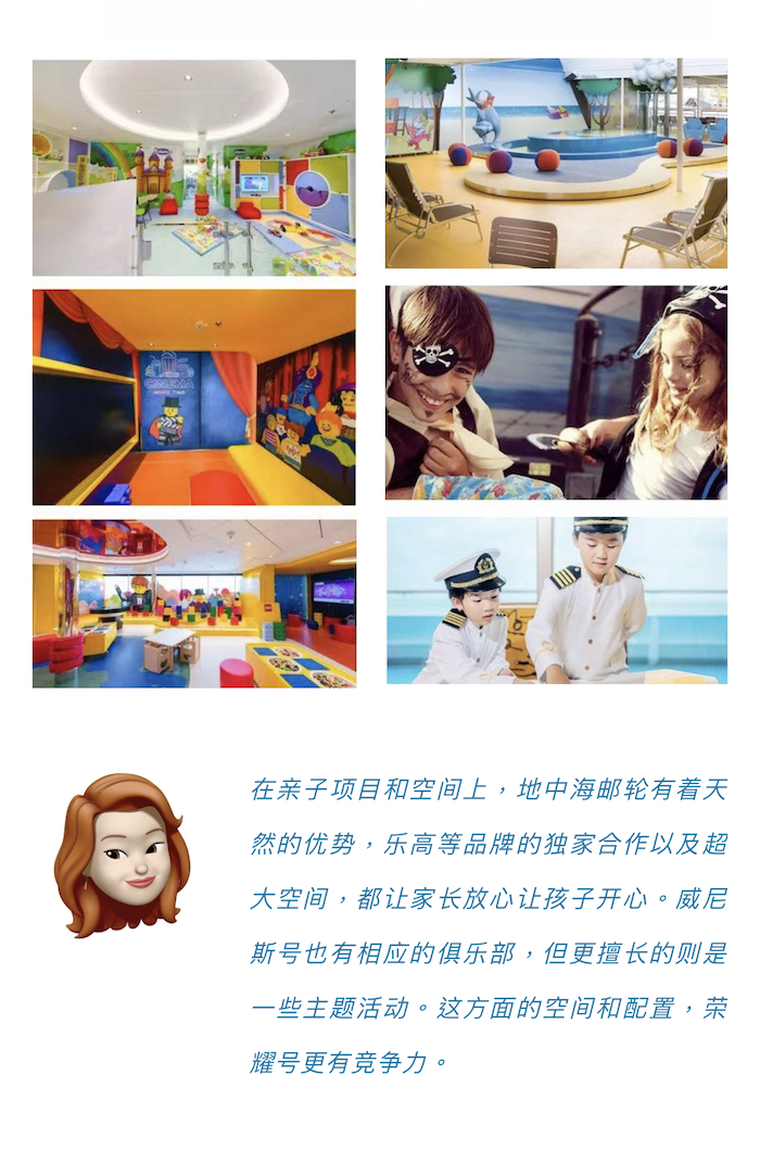 两艘即将来到中国的邮轮,经过对比后或许中国游客会更偏向歌诗达威尼斯号吧。毕竟从硬件设备和软件服务上来说,这艘船都给人一种亲切感。感觉邮轮更多适合家庭出游,那么威尼斯号上的吃、喝、玩、乐、购的确都能满足中国消费者的心里需求和预期。但不能否认的是,如果想更多感受欧洲文化、体验地道邮轮游,还是选择地中海荣耀号比较好。