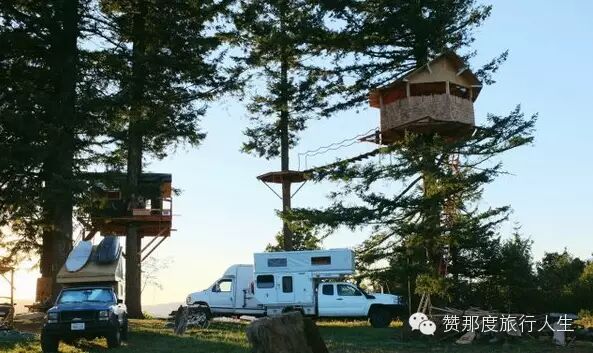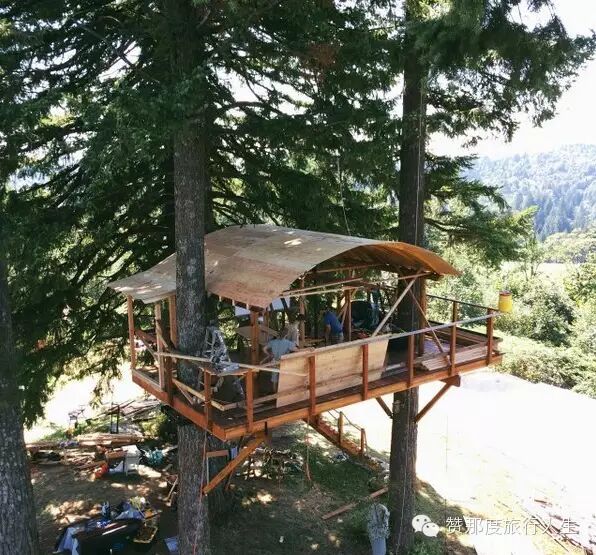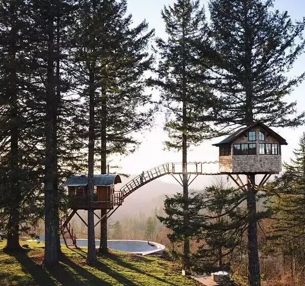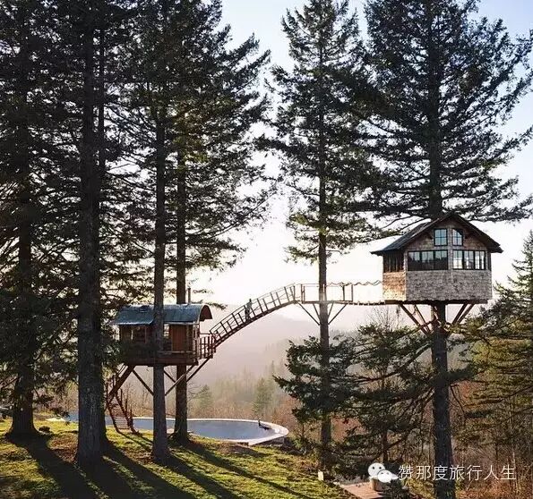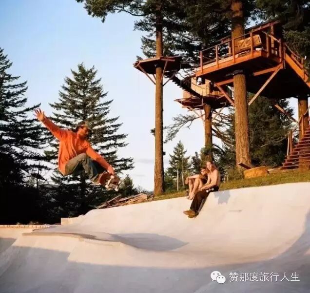 说着,他们走到了山顶的平台上,小路在这里戛然而止,两棵巨大的冷杉的支撑下,两幢一高一低360度全景俯瞰森林的山顶树屋出现在头顶。下面则是滑板场和浴缸。