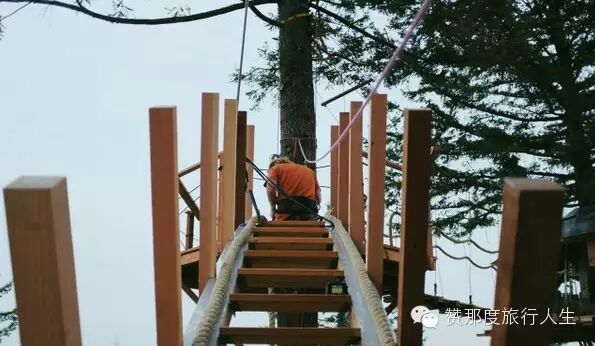 两幢树屋通过7.6米的吊桥链接。
