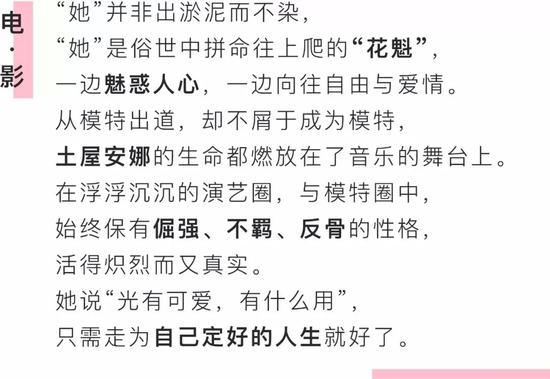 虽然总体而言星路并不顺遂,也并没有大红大紫,可她一直都在挑战开心与痛苦,活得真诚热烈,不顾一切。