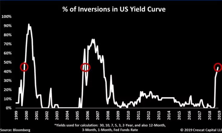 该对冲基金报告指出,目前是时候开始做空,因为美国经济数据正在恶化,在整个债券收益率曲线上,近45%是“倒挂”的。上两次如此之高的时间点在2000年和2007年,资产泡沫在此后不久开始崩溃。