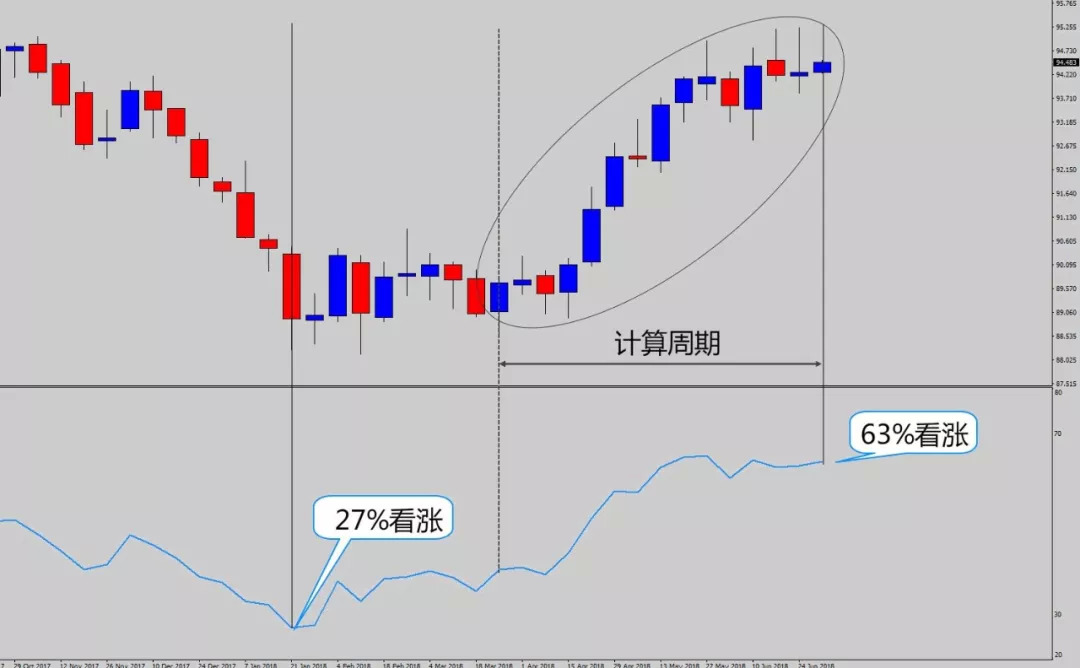 可以看到,如果计算周期内看涨烛台更多,那么RSI的比率就更高。