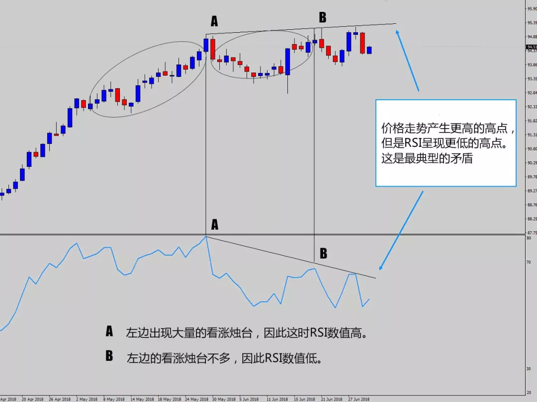 左右两边信息解读不同,因此我们就很好理解为什么会出现矛盾了——因为单边行情的出现减弱了RSI数值。