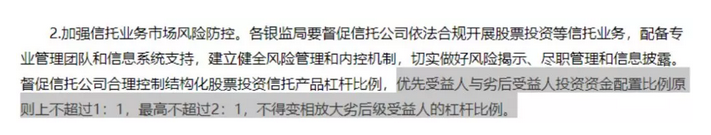 同理,配资公司出资1亿元,按照1:2的杠杆,可以将资金放大到3亿元,而如果配资公司中间做一个夹层的话,杠杆可以放得更大。不过,这种模式有一个缺陷,据业内人士介绍,按照规定,2倍杠杆信托产品需要配置至少20%的固定收益产品,因此资金效率可能会相对偏低。