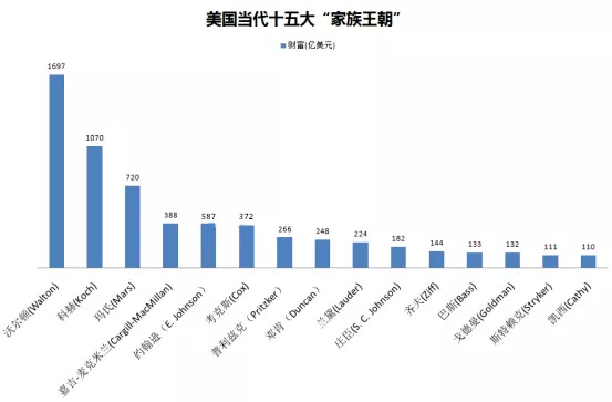 根据福布斯美国400富豪榜,美国智库Institute for Policy Studies统计出了当代美国15大“家族王朝”。