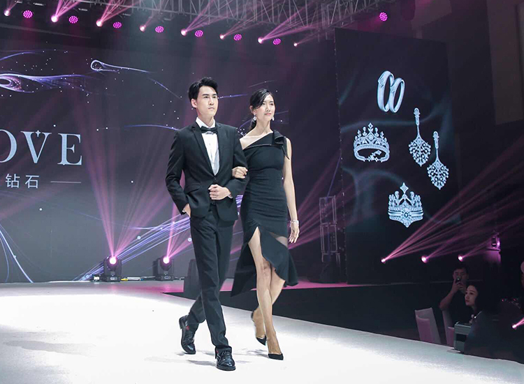 简约大气的主会场,贯穿全场中轴的T台,华丽的灯光秀,模特们身穿由时装品牌MAXRIENY、SIYI HUANG和定制婚纱礼服LOVELUTION COUTURE品牌提供的服装,搭配风格独特的珠宝配饰,为现场来宾呈现了一场时尚盛宴,带大家享受钻石之美、设计之美、时尚之美。