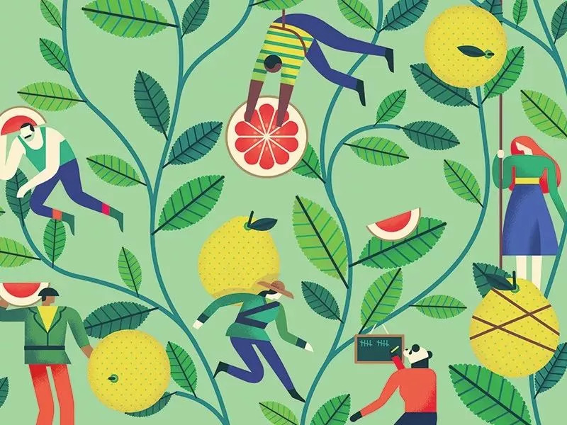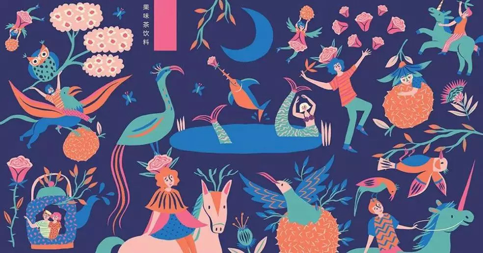 茶π的一系列插画都极具想象力,以茶π中的柚子绿茶为例:绿茶枝丫布满了整个空间,不同肤色服饰的人们仿佛站在一株巨大的茶树上搬运着柚子。