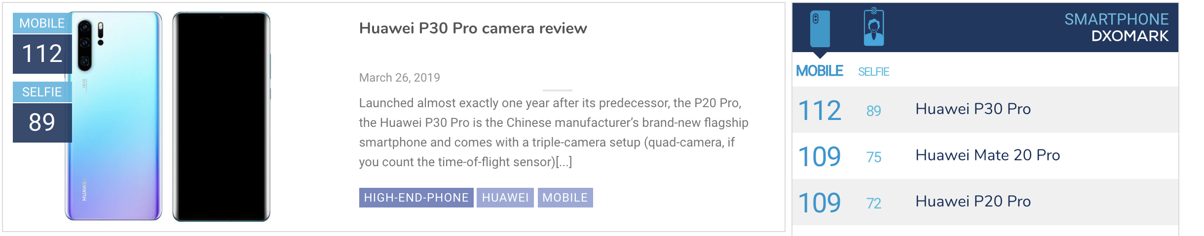 3月26日,华为P30系列手机在法国巴黎发布。此时专业相机测试机构DxOMark官网已经放出了华为P30 Pro的得分及相机测评。网站显示华为P30 Pro的摄影综合评分为112分,拍照得分119,录像得分97分。综合得分超越了此前华为Mate20 Pro和华为P20 Pro创造的109分,目前DxOMark拍照得分榜的前三名都是华为手机,分别为华为P30 Pro、Mate20 Pro和P20 Pro。