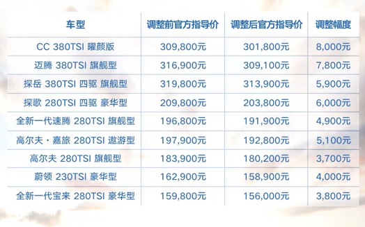 其中,全新一代CC降幅最高,达到8000元。此外,SUV车型方面,探岳380TSI四驱旗舰型降价5900元,调整后官方指导价31.39万元;探歌280TSI四驱豪华型降价6000元,调整后官方指导价20.38万元;全新一代速腾280TSI旗舰型降价4900元,调整后官方指导价19.19万元;高尔夫·嘉旅280TSI遨游型降价5100元,调整后官方指导价19.29万元;高尔夫280TSI旗舰型降价3700元,调整后官方指导价18.02万元;蔚领230TSI豪华型降价4000元,调整后官方指导价15.89万元;全新一代宝来280TSI豪华型降价3800元,调整后官方指导价15.6万元。对于消费者而言,此次降价无疑是个利好消息。
