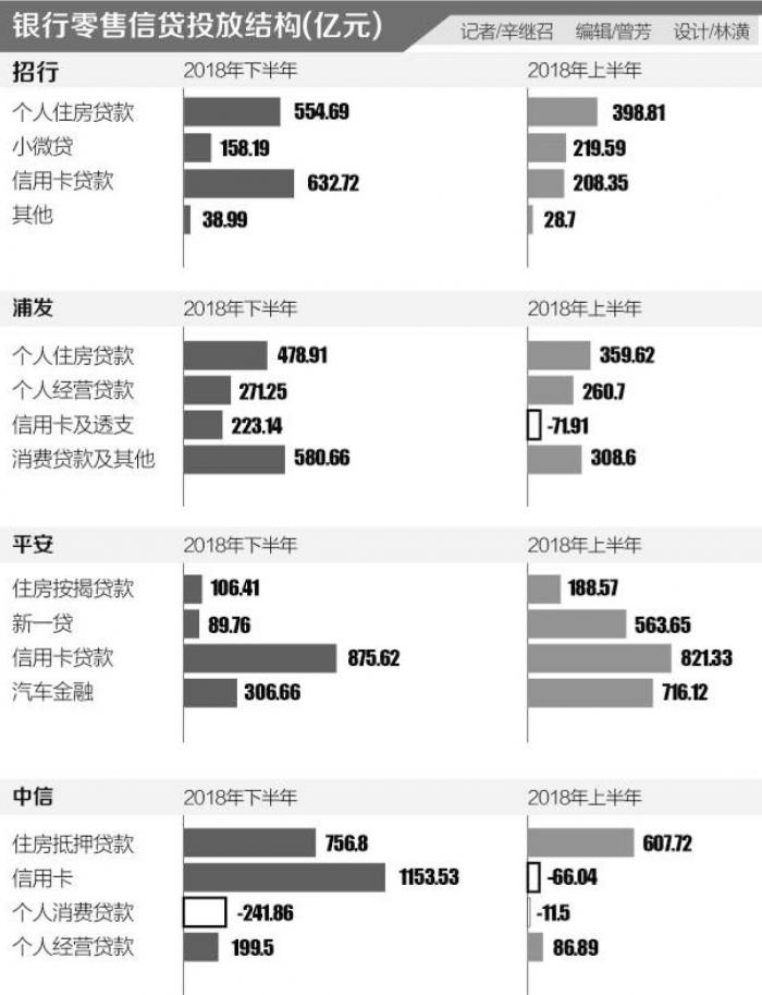21世纪经济报道记者梳理招行、平安、浦发和中信四家股份制银行财报发现,2018年下半年,个人住房贷款投放略有提速,但信用卡放量猛增,远超上半年和其他零售业务。信用卡业务成为零售业务的“绝对主力”,部分银行有意收缩消费贷款。