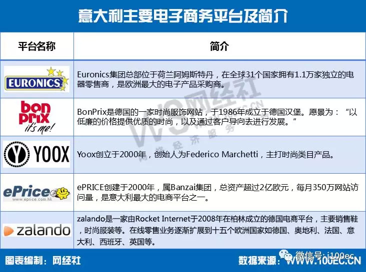 据欧洲电商联盟数据显示,按月UV看,Zalando是意大利访问量最大的B2C电子商务网站,其次是亚马逊、Euronics、IBS、BonPrix。另一个在当地非常受欢迎的电子商务网站是Yoox。