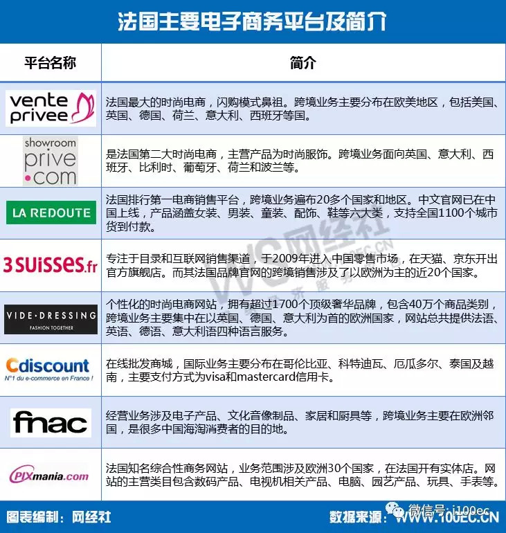 法国主要跨境电商平台:Vente-privée、Showroomprive、La Redoute、3suisses、Videdressing、Cdiscount、Fnac。其中,La Redoute是法国排行第一电商销售平台,跨境业务遍布20多个国家和地区。中文官网已在中国上线,产品涵盖女装、男装、童装、配饰、鞋等六大类,支持全国1100个城市货到付款。Vente-privée是法国最大的时尚电商,闪购模式鼻祖。跨境业务主要分布在欧美地区,包括美国、英国、德国、荷兰、意大利、西班牙等国。