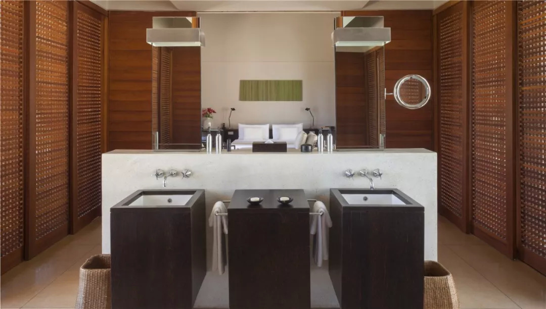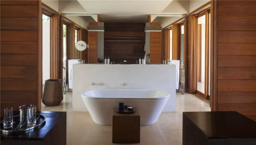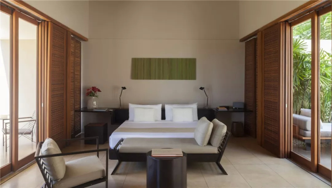 30幢带私人泳池的套房零星点缀在山坡之上,宽敞的卧室以现代风格的木制家具为主,配以赤陶瓷砖的地板,并拥有带浴缸和双人洗漱台的开放式浴室,空间感十足。