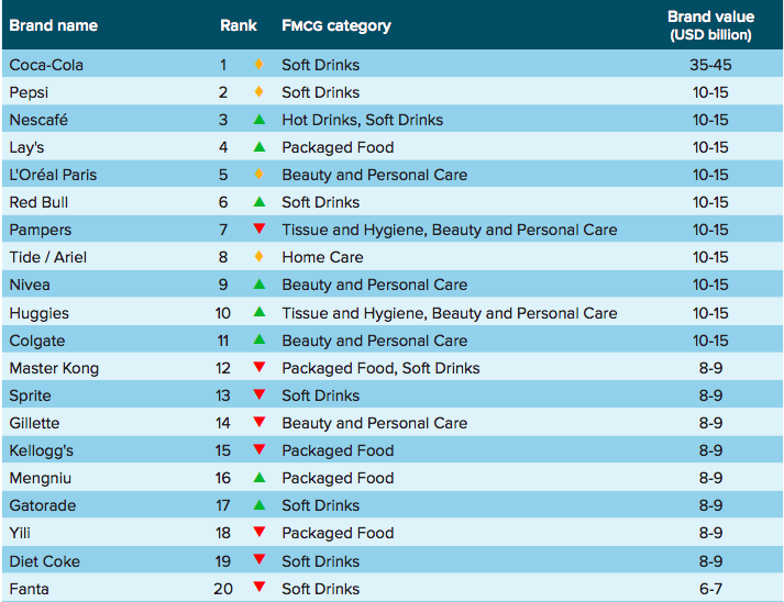 这一排名依据主要来自各个品牌在2017财年的全球零售销售额。中国品牌的最高席位被康师傅夺得(第12名),其次是蒙牛(第16位)、伊利(第18位)和金龙鱼(第24位),它们都是跻身TOP50的佼佼者。除此之外,加多宝位列第55名,娃哈哈第65名,双汇排在第76名。