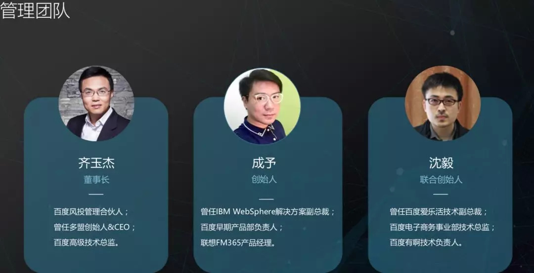 在BP的管理团队介绍中,其董事长并非工商信息中的王成予,而是由百度风投管理合伙人齐玉杰担任。其创始人“成予”曾任IBM WebSphere解决方案副总裁、百度早期产品部负责人、联想FM365产品经理;其联合创始人沈毅曾任百度爱乐活技术副总裁、百度电子商务事业部技术总监、百度有啊技术负责人。