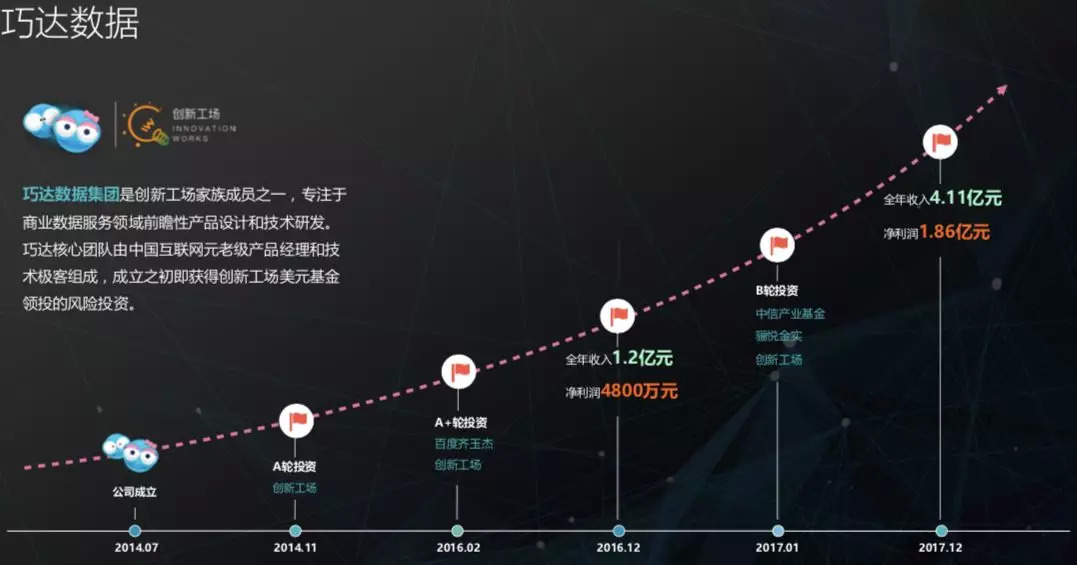 巧达科技对外称,自己是“一家专注于商业数据服务领域前瞻性产品设计和技术研发的公司”。核心团队由“中国互联网元老级产品经理和技术极客”组成。PPT显示,巧达科技在2014年11月获得了来自创新工场的A轮融资,2016年2月获得了来自齐玉杰和创新工场的A+轮融资,2017年1月,获得了来自中信产业基金、骊悦金实、创新工场的B轮融资。