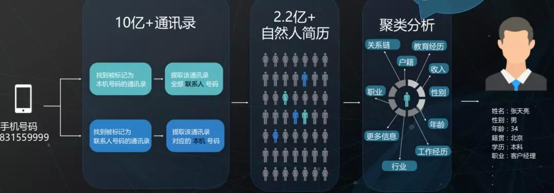 至此,巧达科技宣称通过2.2亿+有简历的自然人、10亿+通讯录、100亿+用户识别ID组合和1000亿+用户综合数据,计算出了8亿+,也就是可能涉及到57%的中国人的多维度数据。