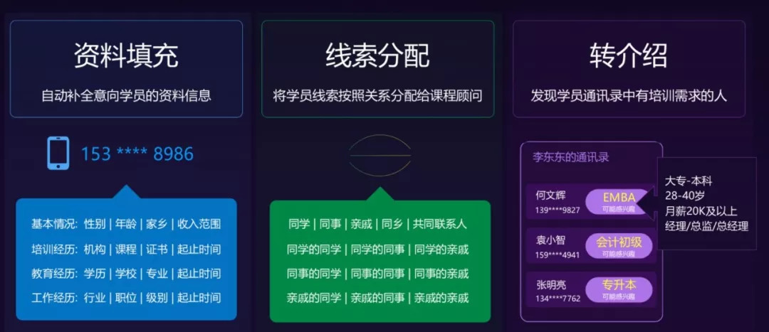 拿教培行业举例,某职业教育培训机构每日新增15万线索号码,但仅有手机号+简单信息,面临需求不明、付费率低、无效沟通增加成本、学员间转介绍困难等问题。巧达科技则可以自动补全意向学员的资料信息,将学员线索按照关系分配给课程顾问,并且发现学员通讯录中有培训需求的人。