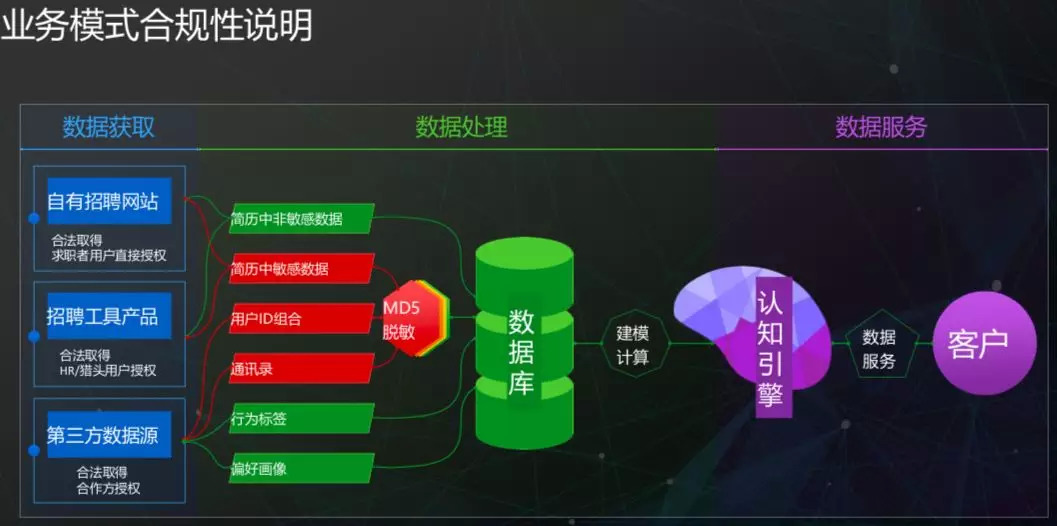 获得数据后,巧达科技将简历中敏感数据、用户ID组合、通讯录进行MD5脱敏,以及简历中非敏感数据、行为标签、偏好画像,一并放入数据库中。数据通过建模计算,结合用户的认知引擎,最后提供给客户。