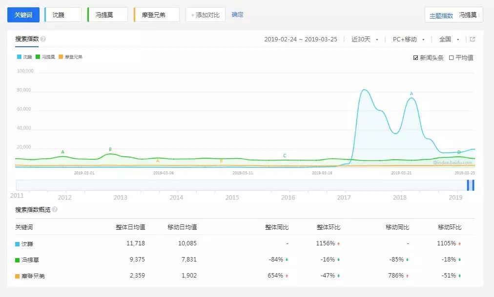 百度指数搜索结果显示,3月18日,“沈巍”两字的搜索指数由前一日的4118飙升至82330,爆发式增长到历史最高峰值,我们以2018年的顶流代表冯提莫和摩登兄弟当天的数据为参考,“沈巍”的搜索指数是“冯提莫”的11倍,是“摩登兄弟”的39倍。此外,其近30天数据相较去年同期环比增长1156%,资讯指数则环比增长5277%,换句话说,沈巍几乎是在一夜之间进入顶流网红序列。