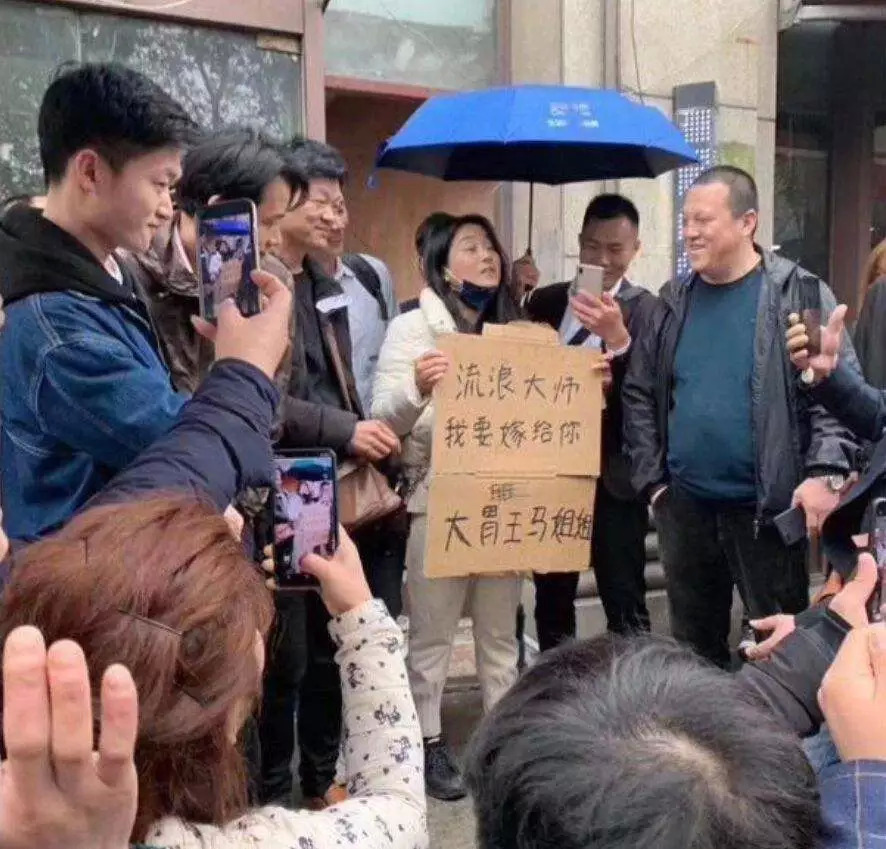 近几天来,“流浪大师”更是被纷至沓来的网红们“蹭”流量,与早前沈巍独自一人在视频中传道授惑不同的是,新流出视频里,沈巍被大量衣着光鲜的网络主播们围堵,求合影、求同框、求金句,甚至有网红打出“流浪大师,我要嫁给你”的招牌,场面夸张而滑稽。