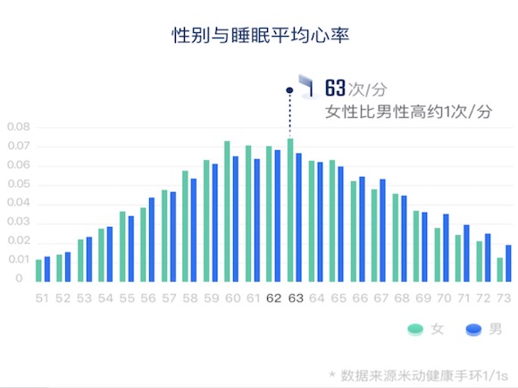 相关研究表明,睡眠平均心率一旦超过66次/分,心脏疾病风险就显著提高,需重点关注。米动大数据显示,米动健康手环用户的睡眠平均心率为63.26,整体均在健康范围内。其中,男性睡眠平均心率在62次/分人数最多,女性相较男性高约1次/分。