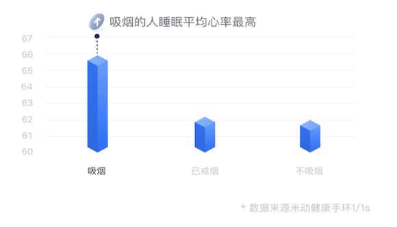 而对于吸烟人群来说,戒烟将会明显改变心脏健康状态。数据显示,从不吸烟的人群睡眠平均心率为62.42,而戒烟人群的睡眠平均心率为62.75,二者差距很小。米动健康手环的用户,在戒烟几天后可能就会发现,自己的睡眠平均心律开始下降,心脏正在变得更健康。