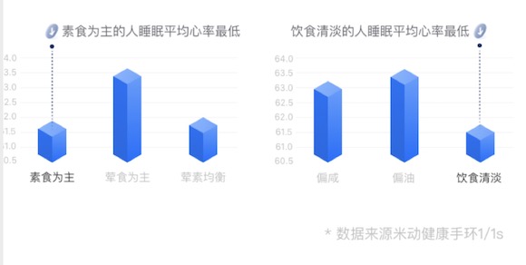 在饮食方面,以荤食为主的人睡眠平均心率最高,而以素食为主的人睡眠平均心率最低,荤素均衡人群的心率则相对处于较低水平。而“重口味”人群需要提高警惕,偏咸、偏油的饮食习惯均会显著影响心率水平。
