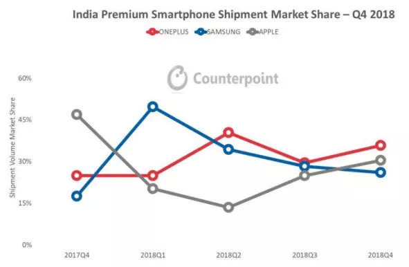 在此之前,2018年第2季度,一加取代了三星和苹果等公司,以40%的份额占据了统治地位,成为3万卢比(约2000元人民币)以上价格区间的最大玩家。