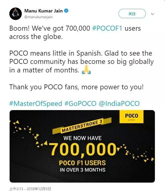 而2018年12月,Manu Jain通过其个人Twitter宣布,在发布3个月之后,小米POCOPHONEF1在全球共卖出70万部。