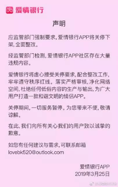 据了解,爱情银行app是一款专为情侣打造的社交聊天软件。近日,因爱情银行发布声明称,应监管部门强制要求,爱情银行APP将关停下架,全面整改。原因是爱情银行APP社区存在大量违规内容登上热搜。